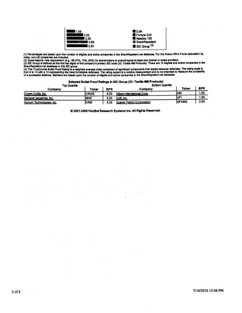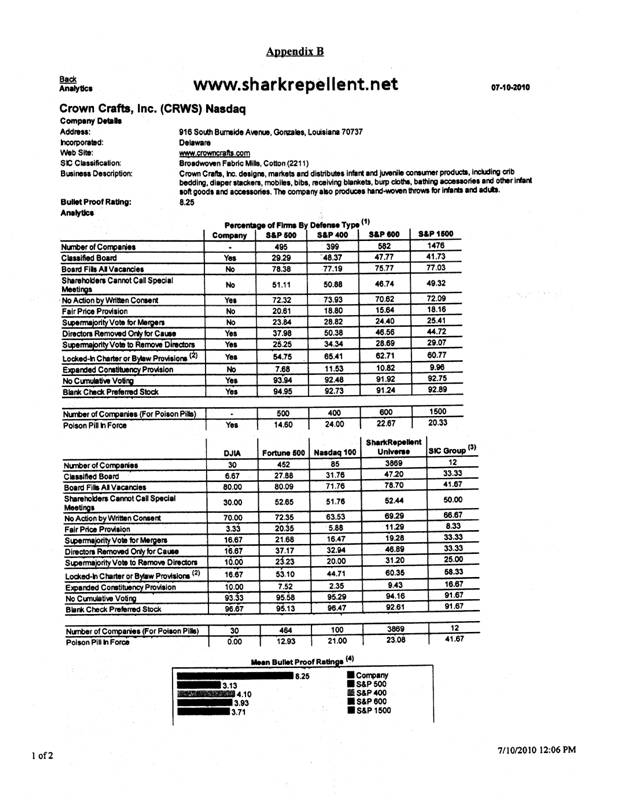 According to the Companys SharkRepellent.net Takeover Defense Profile, which provides a measurement of a company's key takeover defenses, the Company has a Bullet Proof Rating of 8.25 out of 10, as compared to mean Bullet Proof Ratings of 3.13, 1.58, 3.02, 3.89 and 3.83 for companies in the S&P 500, Dow Jones Industrial Average, Fortune 500 and the Companys SIC Group, respectively. We are submitting supplementally in Appendix B attached hereto, the Companys SharkRepellent.net Takeover Defense Profile.