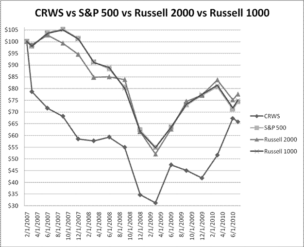 Since February 2007, the Company stock has underperformed as compared to the S&P 500, Russell 1000 and the Russell 2000 as illustrated by the line graph submitting supplementally in Appendix C attached hereto.