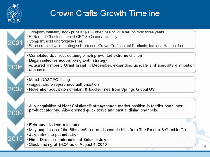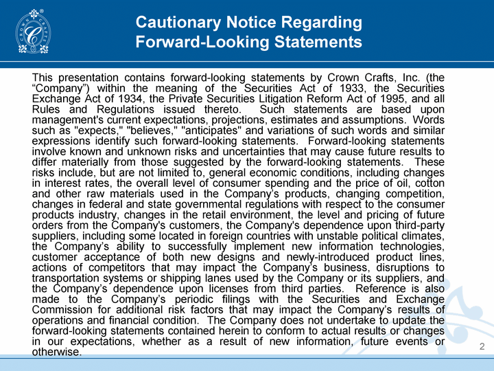 | Cautionary Notice Regarding Forward-Looking Statements This presentation contains forward-looking statements by Crown Crafts, Inc. (the "Company") within the meaning of the Securities Act of 1933, the Securities Exchange Act of 1934, the Private Securities Litigation Reform Act of 1995, and all Rules and Regulations issued thereto. Such statements are based upon management's current expectations, projections, estimates and assumptions. Words such as "expects," "believes," "anticipates" and variations of such words and similar expressions identify such forward-looking statements. Forward-looking statements involve known and unknown risks and uncertainties that may cause future results to differ materially from those suggested by the forward-looking statements. These risks include, but are not limited to, general economic conditions, including changes in interest rates, the overall level of consumer spending and the price of oil, cotton and other raw materials used in the Company's products, changing competition, changes in federal and state governmental regulations with respect to the consumer products industry, changes in the retail environment, the level and pricing of future orders from the Company's customers, the Company's dependence upon third-party suppliers, including some located in foreign countries with unstable political climates, the Company's ability to successfully implement new information technologies, customer acceptance of both new designs and newly-introduced product lines, actions of competitors that may impact the Company's business, disruptions to transportation systems or shipping lanes used by the Company or its suppliers, and the Company's dependence upon licenses from third parties. Reference is also made to the Company's periodic filings with the Securities and Exchange Commission for additional risk factors that may impact the Company's results of operations and financial condition. The Company does not undertake to update the forward-looking statements contained herein to conform to actual results or changes in our expectations, whether as a result of new information, future events or otherwise. 2 |
