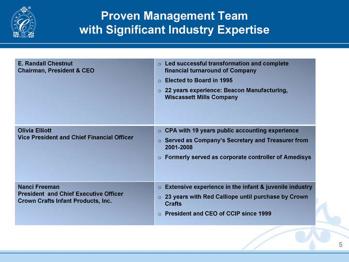 | Proven Management Team with Significant Industry Expertise E. Randall Chestnut Chairman, President & CEO Led successful transformation and complete financial turnaround of Company Elected to Board in 1995 22 years experience: Beacon Manufacturing, Wiscassett Mills Company Olivia Elliott Vice President and Chief Financial Officer CPA with 19 years public accounting experience Served as Company's Secretary and Treasurer from 2001-2008 Formerly served as corporate controller of Amedisys Nanci Freeman President and Chief Executive Officer Crown Crafts Infant Products, Inc. Extensive experience in the infant & juvenile industry 23 years with Red Calliope until purchase by Crown Crafts President and CEO of CCIP since 1999 5 |