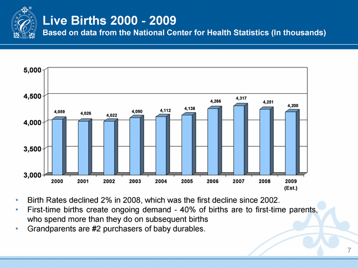 | Live Births 2000 - 2009 Based on data from the National Center for Health Statistics (In thousands) 2000 2001 2002 2003 2004 2005 2006 2007 2008 2009 (Est.) 4058.814 4025.933 4021.726 4089.95 4112.052 4138.349 4265.555 4317.119 4251.095 4200 Birth Rates declined 2% in 2008, which was the first decline since 2002. First-time births create ongoing demand - 40% of births are to first-time parents, who spend more than they do on subsequent births Grandparents are #2 purchasers of baby durables. 7 |