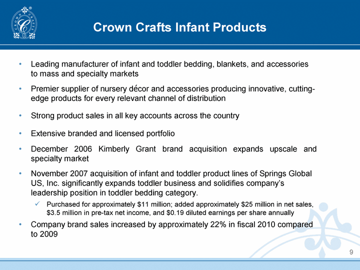 | Crown Crafts Infant Products Leading manufacturer of infant and toddler bedding, blankets, and accessories to mass and specialty markets Premier supplier of nursery decor and accessories producing innovative, cutting- edge products for every relevant channel of distribution Strong product sales in all key accounts across the country Extensive branded and licensed portfolio December 2006 Kimberly Grant brand acquisition expands upscale and specialty market November 2007 acquisition of infant and toddler product lines of Springs Global US, Inc. significantly expands toddler business and solidifies company's leadership position in toddler bedding category. Purchased for approximately $11 million; added approximately $25 million in net sales, $3.5 million in pre-tax net income, and $0.19 diluted earnings per share annually Company brand sales increased by approximately 22% in fiscal 2010 compared to 2009 9 |