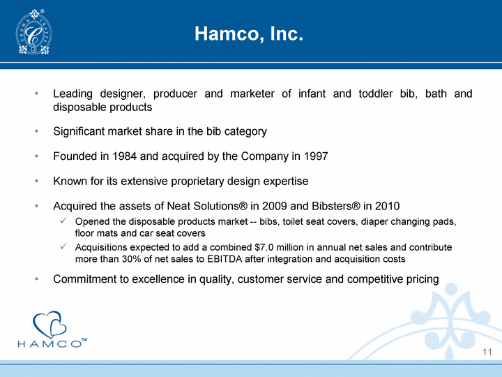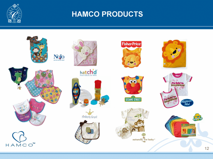 | Hamco, Inc. Leading designer, producer and marketer of infant and toddler bib, bath and disposable products Significant market share in the bib category Founded in 1984 and acquired by the Company in 1997 Known for its extensive proprietary design expertise Acquired the assets of Neat Solutions(r) in 2009 and Bibsters(r) in 2010 Opened the disposable products market -- bibs, toilet seat covers, diaper changing pads, floor mats and car seat covers Acquisitions expected to add a combined $7.0 million in annual net sales and contribute more than 30% of net sales to EBITDA after integration and acquisition costs Commitment to excellence in quality, customer service and competitive pricing 11 |