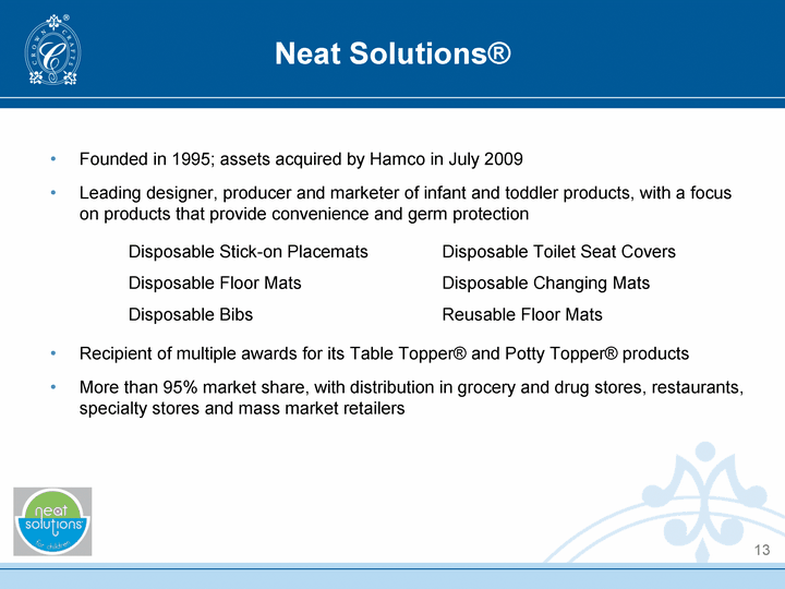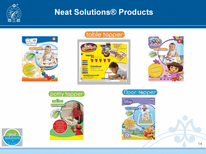 | Neat Solutions(r) Founded in 1995; assets acquired by Hamco in July 2009 Leading designer, producer and marketer of infant and toddler products, with a focus on products that provide convenience and germ protection Disposable Stick-on Placemats Disposable Toilet Seat Covers Disposable Floor Mats Disposable Changing Mats Disposable Bibs Reusable Floor Mats Recipient of multiple awards for its Table Topper(r) and Potty Topper(r) products More than 95% market share, with distribution in grocery and drug stores, restaurants, specialty stores and mass market retailers 13 |