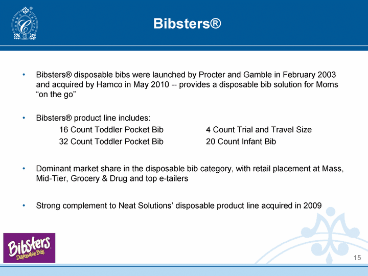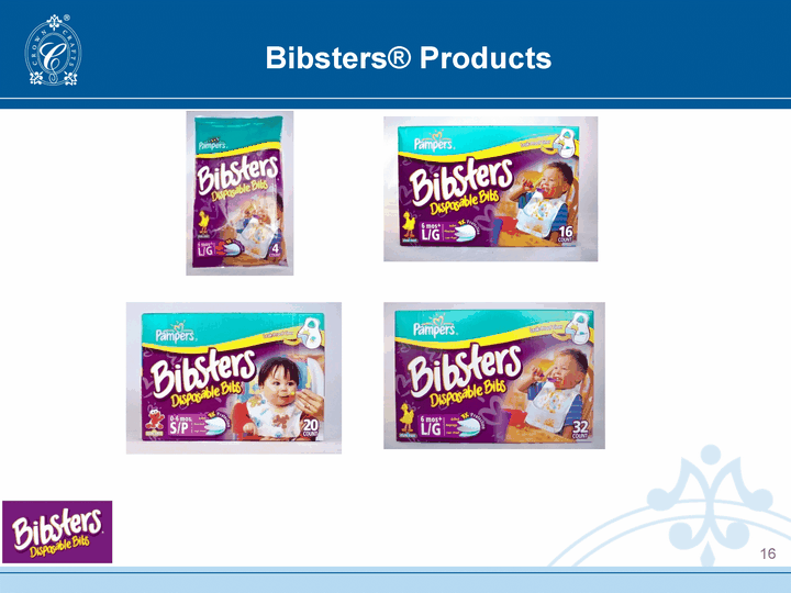 | Bibsters(r) Bibsters(r) disposable bibs were launched by Procter and Gamble in February 2003 and acquired by Hamco in May 2010 -- provides a disposable bib solution for Moms "on the go" Bibsters(r) product line includes: 16 Count Toddler Pocket Bib 4 Count Trial and Travel Size 32 Count Toddler Pocket Bib 20 Count Infant Bib Dominant market share in the disposable bib category, with retail placement at Mass, Mid-Tier, Grocery & Drug and top e-tailers Strong complement to Neat Solutions' disposable product line acquired in 2009 15 |