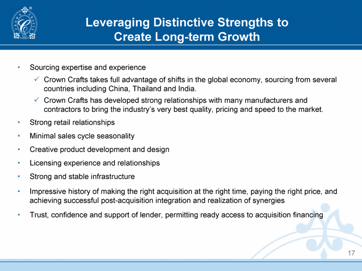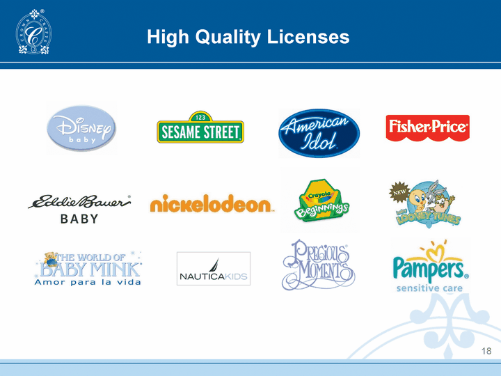 | Leveraging Distinctive Strengths to Create Long-term Growth Sourcing expertise and experience Crown Crafts takes full advantage of shifts in the global economy, sourcing from several countries including China, Thailand and India. Crown Crafts has developed strong relationships with many manufacturers and contractors to bring the industry's very best quality, pricing and speed to the market. Strong retail relationships Minimal sales cycle seasonality Creative product development and design Licensing experience and relationships Strong and stable infrastructure Impressive history of making the right acquisition at the right time, paying the right price, and achieving successful post-acquisition integration and realization of synergies Trust, confidence and support of lender, permitting ready access to acquisition financing 17 |