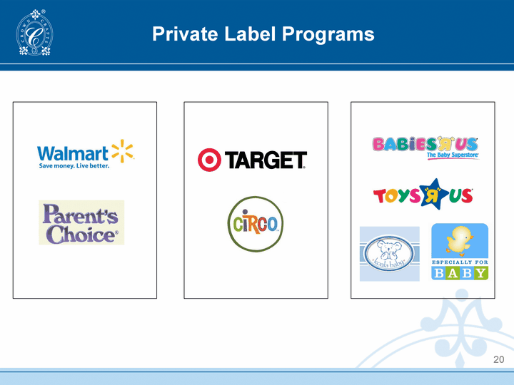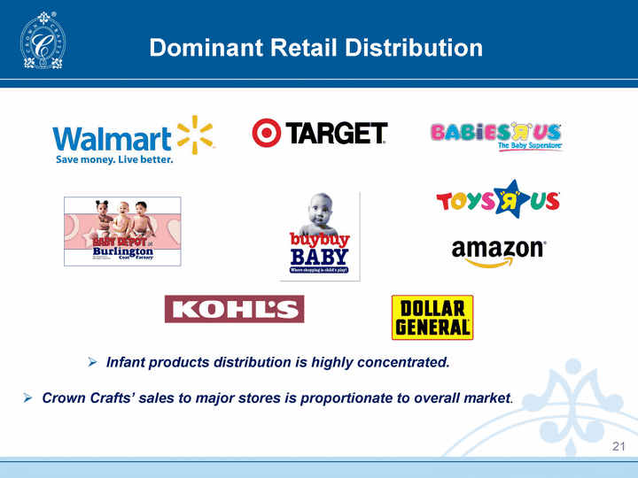 | Dominant Retail Distribution Infant products distribution is highly concentrated. Crown Crafts' sales to major stores is proportionate to overall market. 21 |