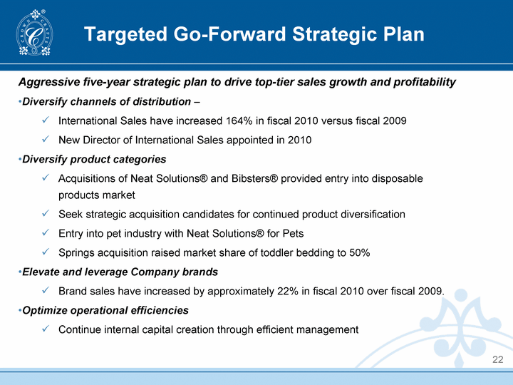 | Targeted Go-Forward Strategic Plan Aggressive five-year strategic plan to drive top-tier sales growth and profitability Diversify channels of distribution - International Sales have increased 164% in fiscal 2010 versus fiscal 2009 New Director of International Sales appointed in 2010 Diversify product categories Acquisitions of Neat Solutions(r) and Bibsters(r) provided entry into disposable products market Seek strategic acquisition candidates for continued product diversification Entry into pet industry with Neat Solutions(r) for Pets Springs acquisition raised market share of toddler bedding to 50% Elevate and leverage Company brands Brand sales have increased by approximately 22% in fiscal 2010 over fiscal 2009. Optimize operational efficiencies Continue internal capital creation through efficient management 22 |