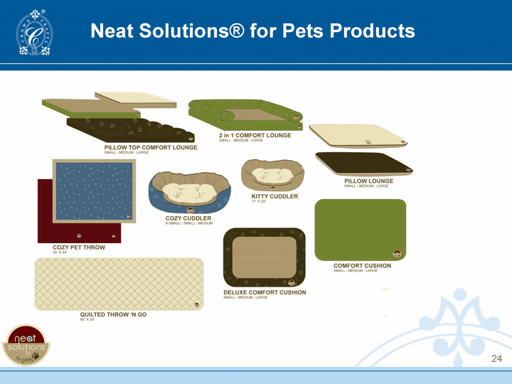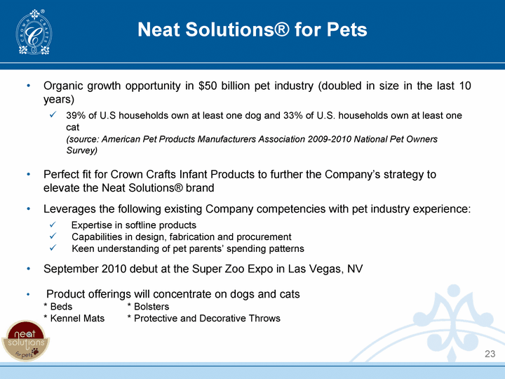| Neat Solutions(r) for Pets Organic growth opportunity in $50 billion pet industry (doubled in size in the last 10 years) 39% of U.S households own at least one dog and 33% of U.S. households own at least one cat (source: American Pet Products Manufacturers Association 2009-2010 National Pet Owners Survey) Perfect fit for Crown Crafts Infant Products to further the Company's strategy to elevate the Neat Solutions(r) brand Leverages the following existing Company competencies with pet industry experience: Expertise in softline products Capabilities in design, fabrication and procurement Keen understanding of pet parents' spending patterns September 2010 debut at the Super Zoo Expo in Las Vegas, NV Product offerings will concentrate on dogs and cats * Beds * Bolsters * Kennel Mats * Protective and Decorative Throws 23 |