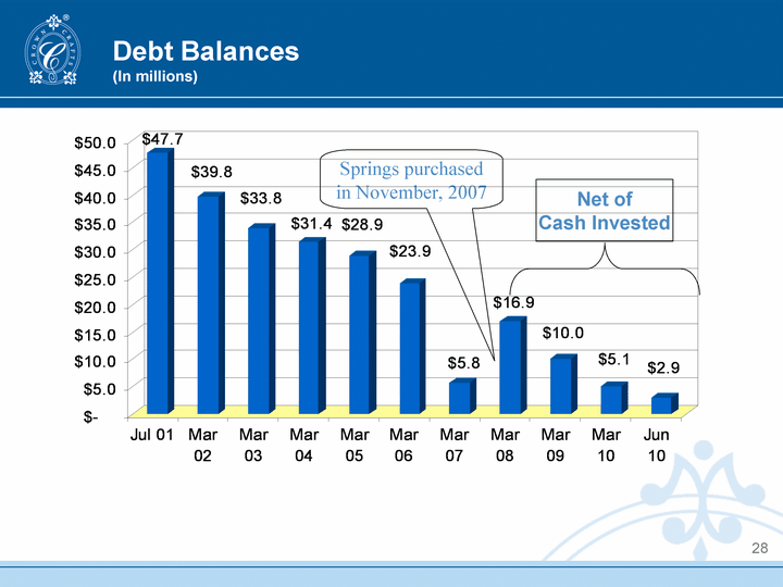 | Debt Balances (In millions) Springs purchased in November, 2007 Net of Cash Invested 28 |
