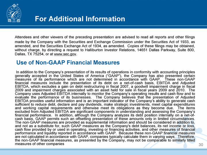 | 30 Attendees and other viewers of the preceding presentation are advised to read all reports and other filings made by the Company with the Securities and Exchange Commission under the Securities Act of 1933, as amended, and the Securities Exchange Act of 1934, as amended. Copies of these filings may be obtained, without charge, by directing a request to Halliburton Investor Relations, 14651 Dallas Parkway, Suite 800, Dallas, TX 75254, or at www.sec.gov. For Additional Information Use of Non-GAAP Financial Measures In addition to the Company's presentation of its results of operations in conformity with accounting principles generally accepted in the United States of America ("GAAP"), the Company has also presented certain measures of its performance which are not determined in accordance with GAAP. These non-GAAP financial measures include the presentation of its debt on a net-of-cash basis, EBITDA and Adjusted EBITDA, which excludes a gain on debt restructuring in fiscal 2007, a goodwill impairment charge in fiscal 2009 and impairment charges associated with an asset held for sale in fiscal years 2009 and 2010. The Company uses Adjusted EBITDA internally to monitor the Company's operating results and cash flow and to evaluate the performance of its businesses. The Company believes that the presentation of Adjusted EBITDA provides useful information and is an important indicator of the Company's ability to generate cash sufficient to reduce debt, declare and pay dividends, make strategic investments, meet capital expenditures and working capital requirements and otherwise meet its obligations as they become due. The items excluded from Adjusted EBITDA are significant components in understanding and assessing the Company's financial performance. In addition, although the Company analyzes its debt position internally on a net-of- cash basis, GAAP permits such an offsetting presentation of these amounts only in limited circumstances. The non-GAAP measures are provided as supplemental information and should be considered in addition to, and not as a substitute for, such GAAP measures as the Company's debt balances, its net income or loss, cash flow provided by or used in operating, investing or financing activities, and other measures of financial performance and liquidity reported in accordance with GAAP. Because these non-GAAP financial measures are not calculated in accordance with GAAP, companies typically calculate them in varying ways. Therefore, the non-GAAP financial measures, as presented by the Company, may not be comparable to similarly titled measures of other companies |