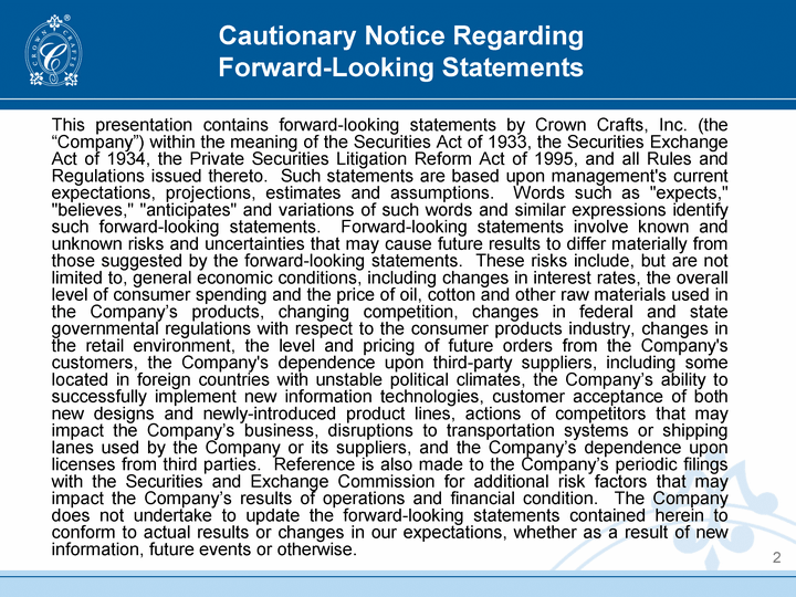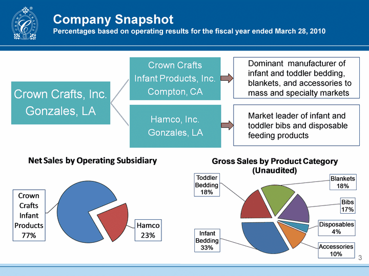 | Cautionary Notice Regarding Forward-Looking Statements This presentation contains forward-looking statements by Crown Crafts, Inc. (the "Company") within the meaning of the Securities Act of 1933, the Securities Exchange Act of 1934, the Private Securities Litigation Reform Act of 1995, and all Rules and Regulations issued thereto. Such statements are based upon management's current expectations, projections, estimates and assumptions. Words such as "expects," "believes," "anticipates" and variations of such words and similar expressions identify such forward-looking statements. Forward-looking statements involve known and unknown risks and uncertainties that may cause future results to differ materially from those suggested by the forward-looking statements. These risks include, but are not limited to, general economic conditions, including changes in interest rates, the overall level of consumer spending and the price of oil, cotton and other raw materials used in the Company's products, changing competition, changes in federal and state governmental regulations with respect to the consumer products industry, changes in the retail environment, the level and pricing of future orders from the Company's customers, the Company's dependence upon third-party suppliers, including some located in foreign countries with unstable political climates, the Company's ability to successfully implement new information technologies, customer acceptance of both new designs and newly-introduced product lines, actions of competitors that may impact the Company's business, disruptions to transportation systems or shipping lanes used by the Company or its suppliers, and the Company's dependence upon licenses from third parties. Reference is also made to the Company's periodic filings with the Securities and Exchange Commission for additional risk factors that may impact the Company's results of operations and financial condition. The Company does not undertake to update the forward-looking statements contained herein to conform to actual results or changes in our expectations, whether as a result of new information, future events or otherwise. 2 |