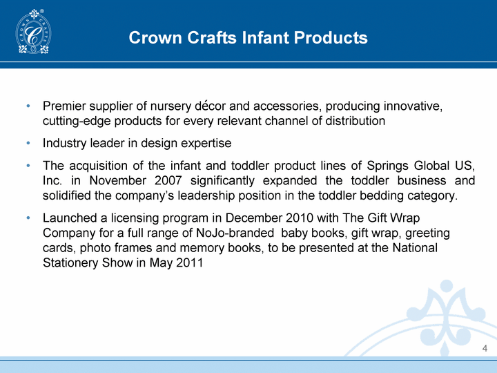 | Company Snapshot Percentages based on operating results for the fiscal year ended March 28, 2010 3 Dominant manufacturer of infant and toddler bedding, blankets, and accessories to mass and specialty markets Market leader of infant and toddler bibs and disposable feeding products |