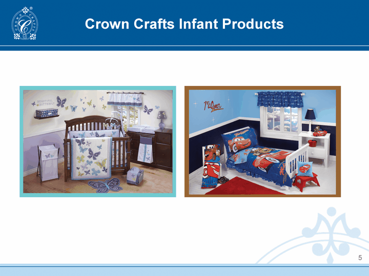 | Crown Crafts Infant Products Premier supplier of nursery decor and accessories, producing innovative, cutting-edge products for every relevant channel of distribution Industry leader in design expertise The acquisition of the infant and toddler product lines of Springs Global US, Inc. in November 2007 significantly expanded the toddler business and solidified the company's leadership position in the toddler bedding category. Launched a licensing program in December 2010 with The Gift Wrap Company for a full range of NoJo-branded baby books, gift wrap, greeting cards, photo frames and memory books, to be presented at the National Stationery Show in May 2011 4 |