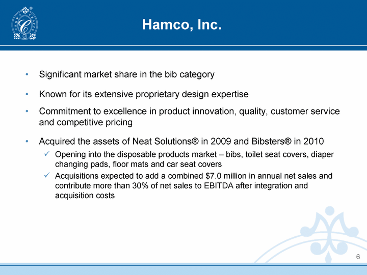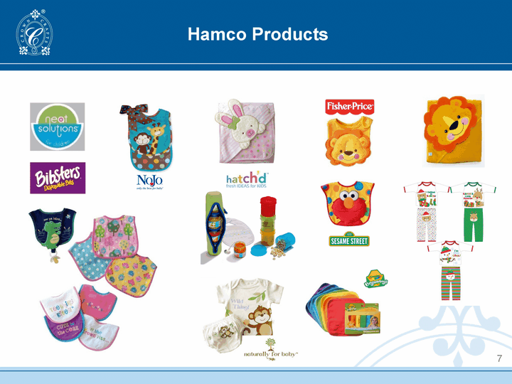 | Hamco, Inc. Significant market share in the bib category Known for its extensive proprietary design expertise Commitment to excellence in product innovation, quality, customer service and competitive pricing Acquired the assets of Neat Solutions(r) in 2009 and Bibsters(r) in 2010 Opening into the disposable products market - bibs, toilet seat covers, diaper changing pads, floor mats and car seat covers Acquisitions expected to add a combined $7.0 million in annual net sales and contribute more than 30% of net sales to EBITDA after integration and acquisition costs 6 |