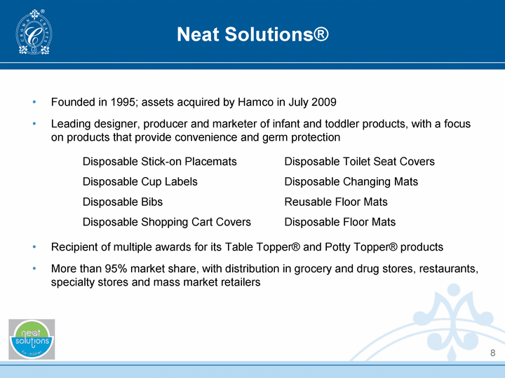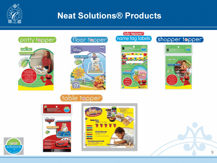 | Neat Solutions(r) Founded in 1995; assets acquired by Hamco in July 2009 Leading designer, producer and marketer of infant and toddler products, with a focus on products that provide convenience and germ protection Disposable Stick-on Placemats Disposable Toilet Seat Covers Disposable Cup Labels Disposable Changing Mats Disposable Bibs Reusable Floor Mats Disposable Shopping Cart Covers Disposable Floor Mats Recipient of multiple awards for its Table Topper(r) and Potty Topper(r) products More than 95% market share, with distribution in grocery and drug stores, restaurants, specialty stores and mass market retailers 8 |