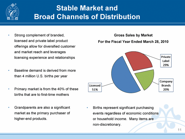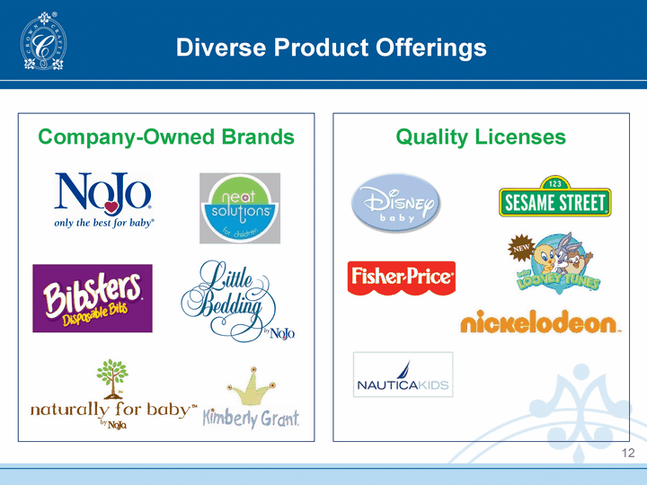 | Stable Market and Broad Channels of Distribution 11 Strong complement of branded, licensed and private label product offerings allow for diversified customer and market reach and leverages licensing experience and relationships Baseline demand is derived from more than 4 million U.S. births per year Primary market is from the 40% of these births that are to first-time mothers Grandparents are also a significant market as the primary purchaser of higher-end products. Gross Sales by Market For the Fiscal Year Ended March 28, 2010 (percentages - Unaudited) Births represent significant purchasing events regardless of economic conditions or household income. Many items are non-discretionary. |