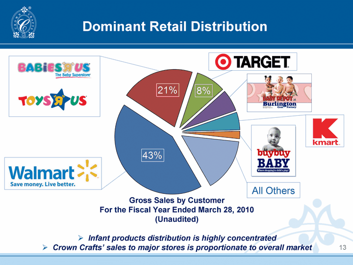 | Dominant Retail Distribution Gross Sales by Customer For the Fiscal Year Ended March 28, 2010 (Unaudited) Infant products distribution is highly concentrated Crown Crafts' sales to major stores is proportionate to overall market 13 All Others |