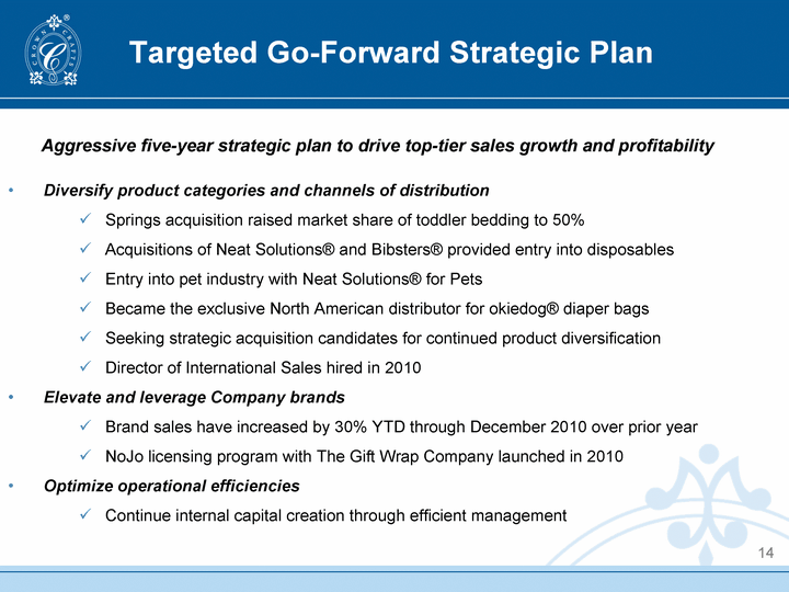 | Targeted Go-Forward Strategic Plan Diversify product categories and channels of distribution Springs acquisition raised market share of toddler bedding to 50% Acquisitions of Neat Solutions(r) and Bibsters(r) provided entry into disposables Entry into pet industry with Neat Solutions(r) for Pets Became the exclusive North American distributor for okiedog(r) diaper bags Seeking strategic acquisition candidates for continued product diversification Director of International Sales hired in 2010 Elevate and leverage Company brands Brand sales have increased by 30% YTD through December 2010 over prior year NoJo licensing program with The Gift Wrap Company launched in 2010 Optimize operational efficiencies Continue internal capital creation through efficient management 14 Aggressive five-year strategic plan to drive top-tier sales growth and profitability |