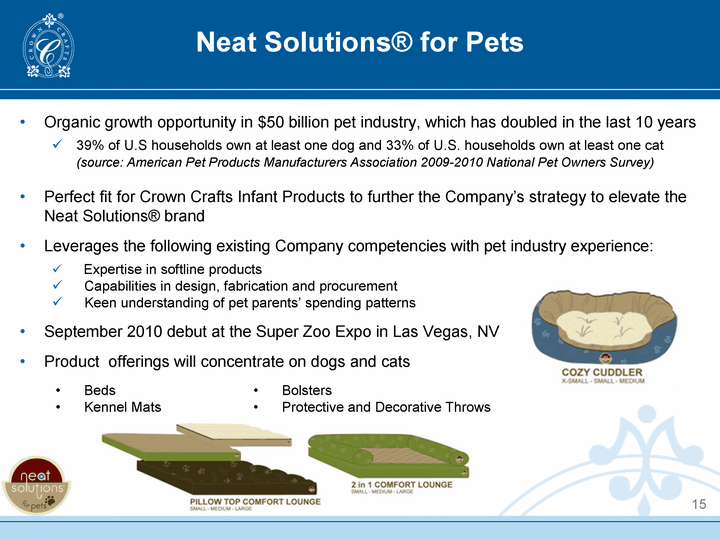 | Neat Solutions(r) for Pets Organic growth opportunity in $50 billion pet industry, which has doubled in the last 10 years 39% of U.S households own at least one dog and 33% of U.S. households own at least one cat (source: American Pet Products Manufacturers Association 2009-2010 National Pet Owners Survey) Perfect fit for Crown Crafts Infant Products to further the Company's strategy to elevate the Neat Solutions(r) brand Leverages the following existing Company competencies with pet industry experience: Expertise in softline products Capabilities in design, fabrication and procurement Keen understanding of pet parents' spending patterns September 2010 debut at the Super Zoo Expo in Las Vegas, NV Product offerings will concentrate on dogs and cats 15 Beds Kennel Mats Bolsters Protective and Decorative Throws |