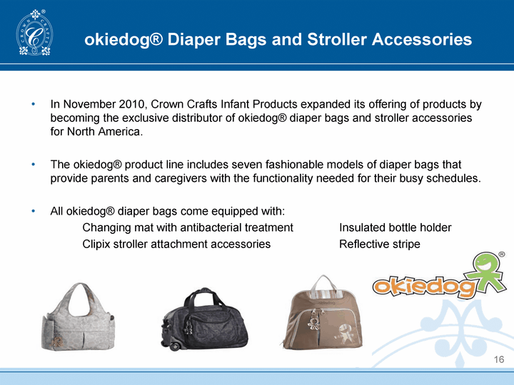 | okiedog(r) Diaper Bags and Stroller Accessories 16 In November 2010, Crown Crafts Infant Products expanded its offering of products by becoming the exclusive distributor of okiedog(r) diaper bags and stroller accessories for North America. The okiedog(r) product line includes seven fashionable models of diaper bags that provide parents and caregivers with the functionality needed for their busy schedules. All okiedog(r) diaper bags come equipped with: Changing mat with antibacterial treatment Insulated bottle holder Clipix stroller attachment accessories Reflective stripe |