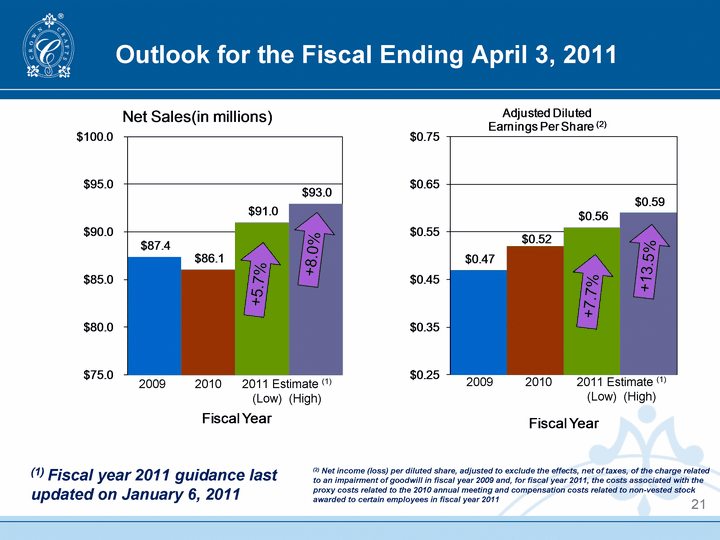 | Outlook for the Fiscal Ending April 3, 2011 21 2011 Estimate (1) (Low) (High) 2010 2009 2009 2010 2011 Estimate (1) (Low) (High) (1) Fiscal year 2011 guidance last updated on January 6, 2011 (2) Net income (loss) per diluted share, adjusted to exclude the effects, net of taxes, of the charge related to an impairment of goodwill in fiscal year 2009 and, for fiscal year 2011, the costs associated with the proxy costs related to the 2010 annual meeting and compensation costs related to non-vested stock awarded to certain employees in fiscal year 2011 |
