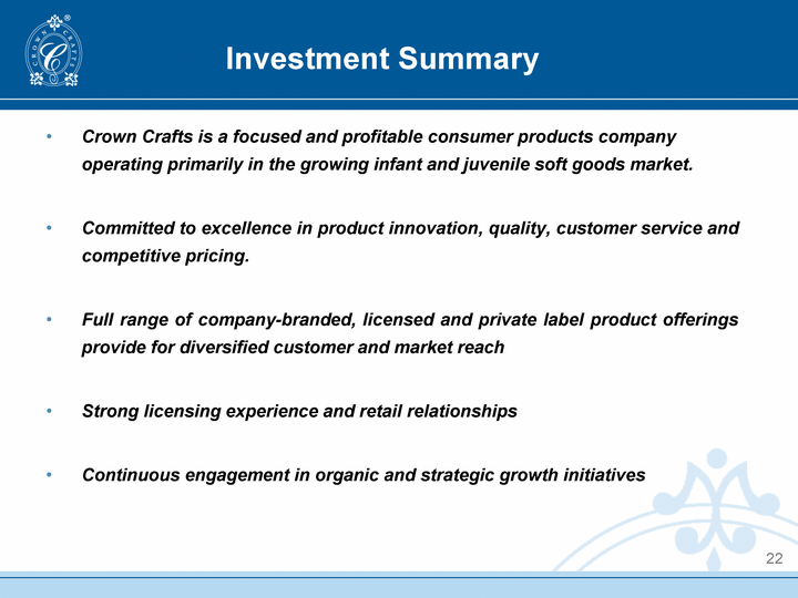 | Investment Summary Crown Crafts is a focused and profitable consumer products company operating primarily in the growing infant and juvenile soft goods market. Committed to excellence in product innovation, quality, customer service and competitive pricing. Full range of company-branded, licensed and private label product offerings provide for diversified customer and market reach Strong licensing experience and retail relationships Continuous engagement in organic and strategic growth initiatives 22 |