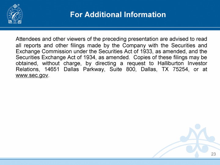 | 23 Attendees and other viewers of the preceding presentation are advised to read all reports and other filings made by the Company with the Securities and Exchange Commission under the Securities Act of 1933, as amended, and the Securities Exchange Act of 1934, as amended. Copies of these filings may be obtained, without charge, by directing a request to Halliburton Investor Relations, 14651 Dallas Parkway, Suite 800, Dallas, TX 75254, or at www.sec.gov. For Additional Information |