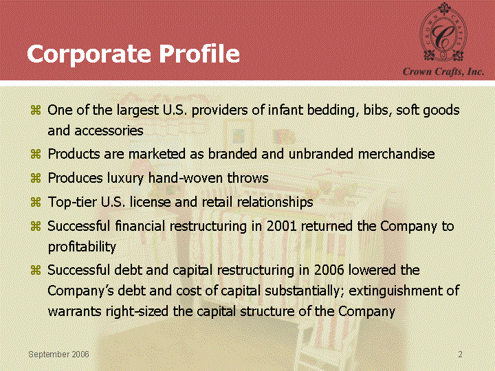| Corporate Profile One of the largest U.S. providers of infant bedding, bibs, soft goods and accessories Products are marketed as branded and unbranded merchandise Produces luxury hand-woven throws Top-tier U.S. license and retail relationships Successful financial restructuring in 2001 returned the Company to profitability Successful debt and capital restructuring in 2006 lowered the Company's debt and cost of capital substantially; extinguishment of warrants right-sized the capital structure of the Company |