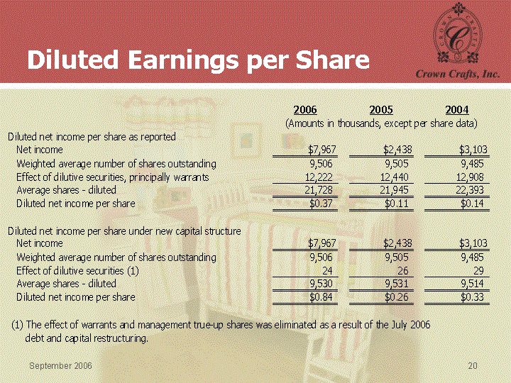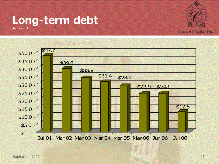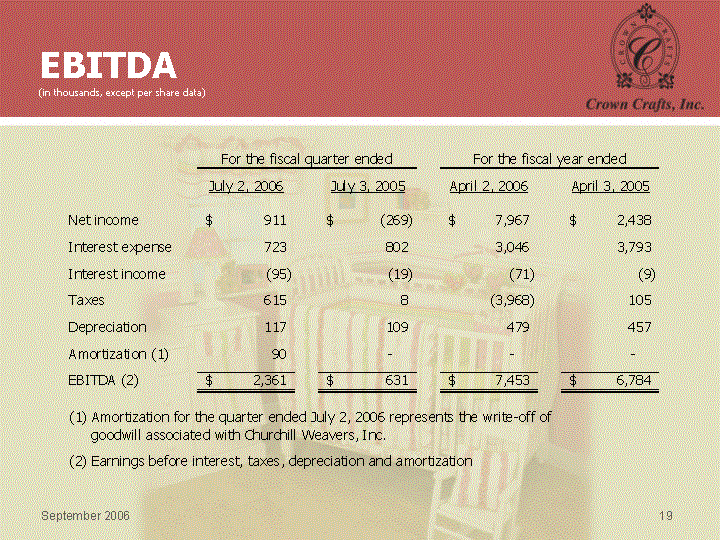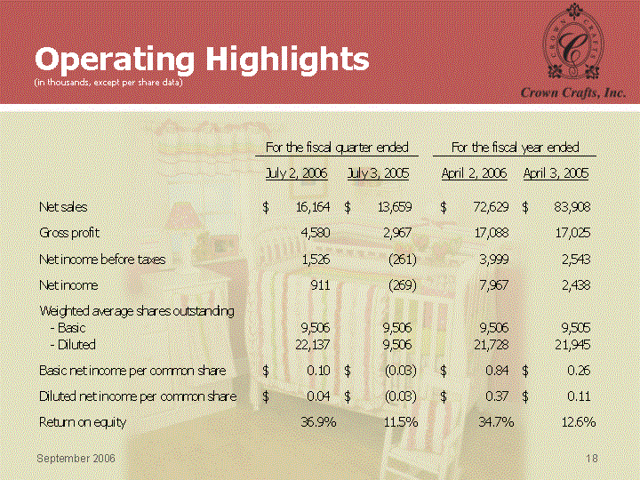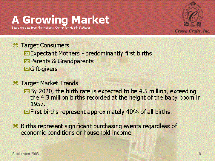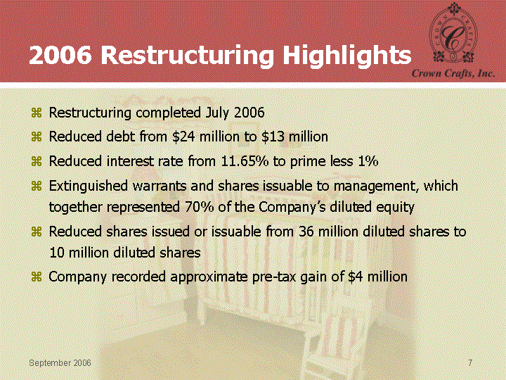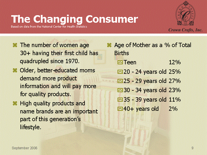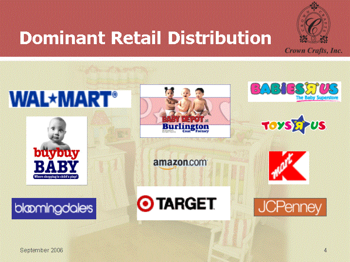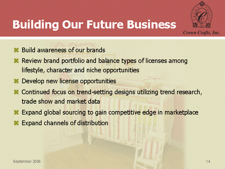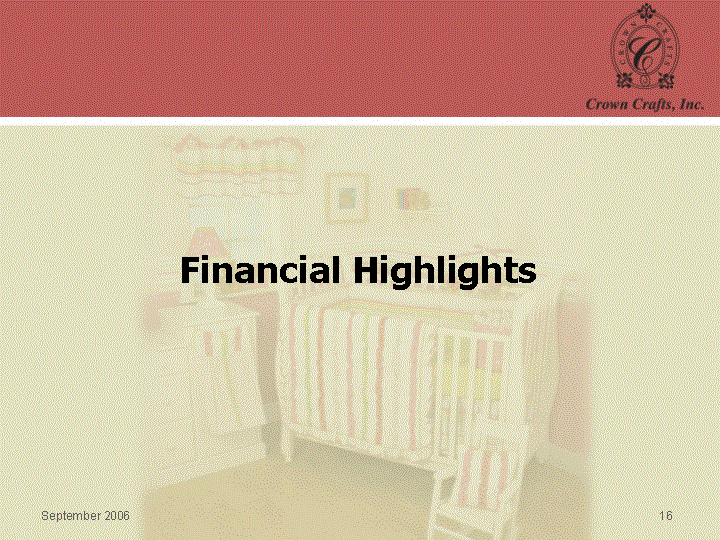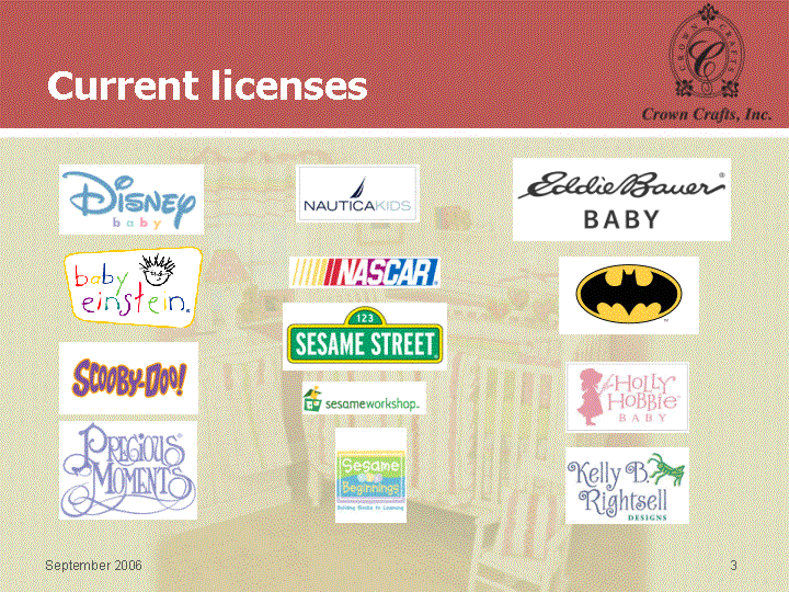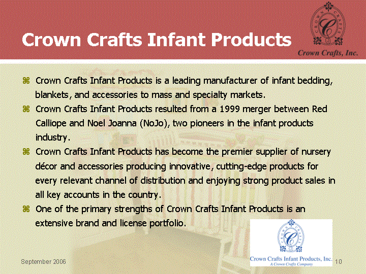 | CROWN CRAFTS, INC. OTC: CRWS September 2006 This release contains forward-looking statements within the meaning of the Securities Act of 1933, the Securities Exchange Act of 1934 and the Private Securities Litigation Reform Act of 1995. Such statements are based upon management's current expectations, projections, estimates and assumptions. Words such as "expects," "believes," "anticipates" and variations of such words and similar expressions identify such forward-looking statements. Forward-looking statements involve known and unknown risks and uncertainties that may cause future results to differ materially from those suggested by the forward-looking statements. These risks include, among others, general economic conditions, including changes in interest rates, in the overall level of consumer spending and in the price of oil, cotton and other raw materials used in the Company's products, changing competition, changes in the retail environment, the level and pricing of future orders from the Company's customers, the Company's dependence upon third-party suppliers, including some located in foreign countries, customer acceptance of both new designs and newly-introduced product lines, actions of competitors that may impact the Company's business, disruptions to transportation systems or shipping lanes used by the Company or its suppliers, and the Company's dependence upon licenses from third parties. Reference is also made to the Company's periodic filings with the Securities and Exchange Commission for additional factors that may impact the Company's results of operations and financial condition. The Company does not undertake to update the forward-looking statements contained herein to conform to actual results or changes in our expectations, whether as a result of new information, future events or otherwise. |