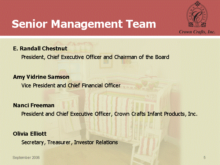 | Senior Management Team E. Randall Chestnut President, Chief Executive Officer and Chairman of the Board Amy Vidrine Samson Vice President and Chief Financial Officer Nanci Freeman President and Chief Executive Officer, Crown Crafts Infant Products, Inc. Olivia Elliott Secretary, Treasurer, Investor Relations |