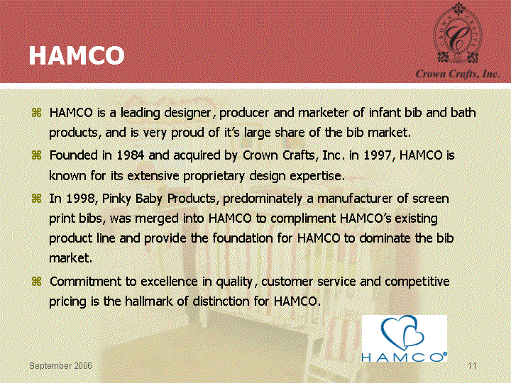 | HAMCO HAMCO is a leading designer, producer and marketer of infant bib and bath products, and is very proud of it's large share of the bib market. Founded in 1984 and acquired by Crown Crafts, Inc. in 1997, HAMCO is known for its extensive proprietary design expertise. In 1998, Pinky Baby Products, predominately a manufacturer of screen print bibs, was merged into HAMCO to compliment HAMCO's existing product line and provide the foundation for HAMCO to dominate the bib market. Commitment to excellence in quality, customer service and competitive pricing is the hallmark of distinction for HAMCO. |