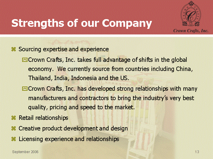 | Strengths of our Company Sourcing expertise and experience Crown Crafts, Inc. takes full advantage of shifts in the global economy. We currently source from countries including China, Thailand, India, Indonesia and the US. Crown Crafts, Inc. has developed strong relationships with many manufacturers and contractors to bring the industry's very best quality, pricing and speed to the market. Retail relationships Creative product development and design Licensing experience and relationships |