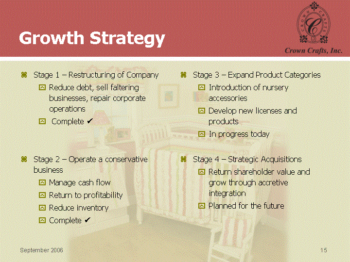 | Growth Strategy Stage 1 - Restructuring of Company Reduce debt, sell faltering businesses, repair corporate operations Complete u Stage 2 - Operate a conservative business Manage cash flow Return to profitability Reduce inventory Complete u Stage 3 - Expand Product Categories Introduction of nursery accessories Develop new licenses and products In progress today Stage 4 - Strategic Acquisitions Return shareholder value and grow through accretive integration Planned for the future |