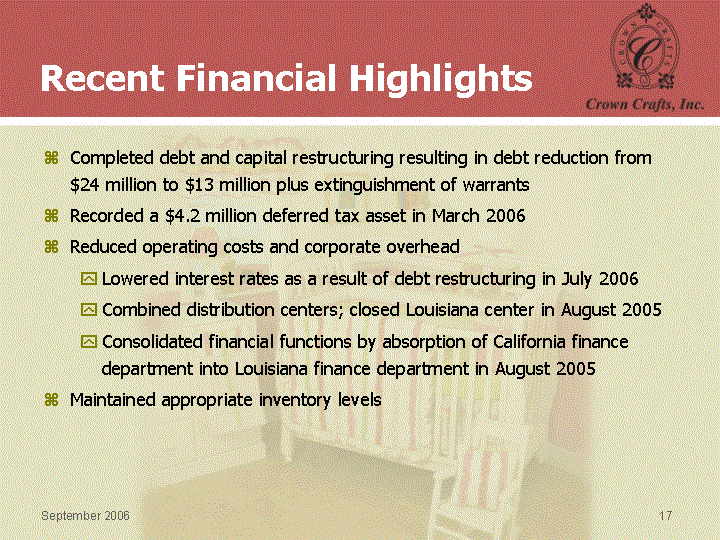 | Recent Financial Highlights Completed debt and capital restructuring resulting in debt reduction from $24 million to $13 million plus extinguishment of warrants Recorded a $4.2 million deferred tax asset in March 2006 Reduced operating costs and corporate overhead Lowered interest rates as a result of debt restructuring in July 2006 Combined distribution centers; closed Louisiana center in August 2005 Consolidated financial functions by absorption of California finance department into Louisiana finance department in August 2005 Maintained appropriate inventory levels |