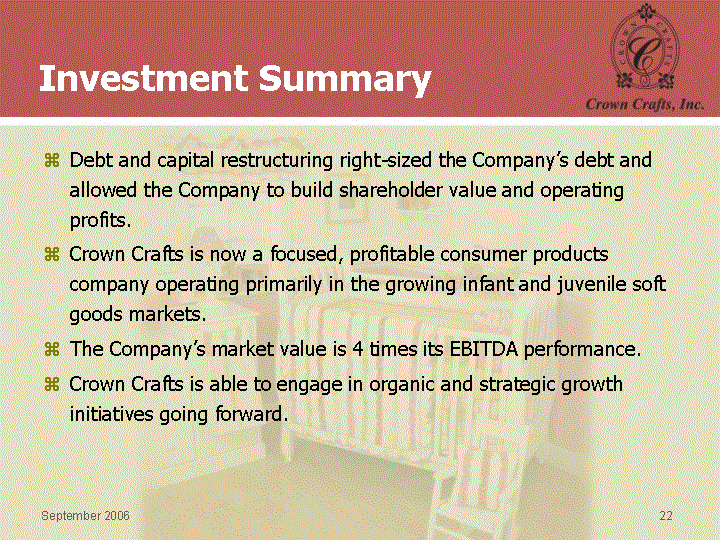 | Investment Summary Debt and capital restructuring right-sized the Company's debt and allowed the Company to build shareholder value and operating profits. Crown Crafts is now a focused, profitable consumer products company operating primarily in the growing infant and juvenile soft goods markets. The Company's market value is 4 times its EBITDA performance. Crown Crafts is able to engage in organic and strategic growth initiatives going forward. |