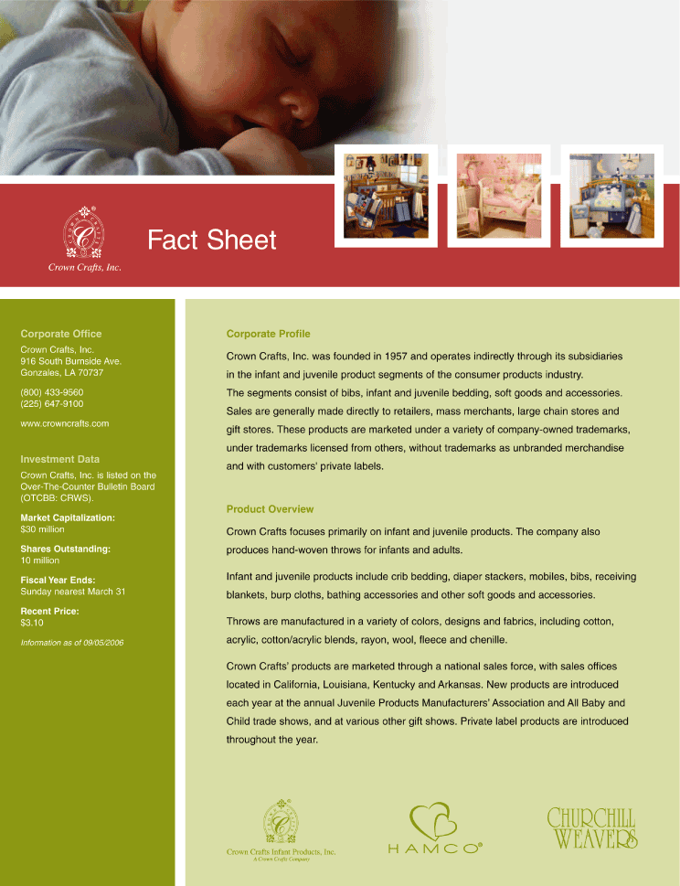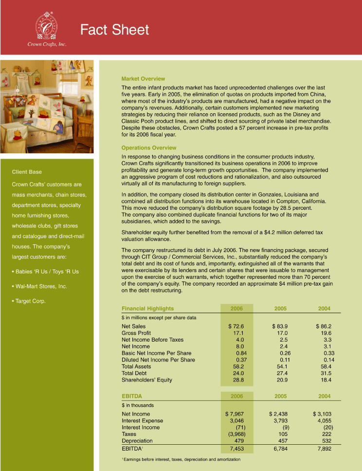 In response to changing business conditions in the consumer products industry, Crown Crafts significantly transitioned its business operations in 2006 to improve profitability and generate long-term growth opportunities. The company implemented an aggressive program of cost reductions and rationalization, and also outsourced virtually all of its manufacturing to foreign suppliers.