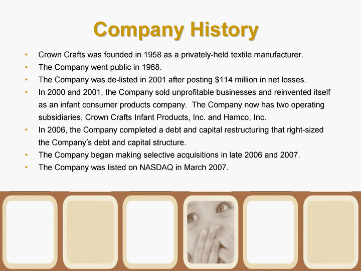 | Crown Crafts was founded in 1958 as a privately-held textile manufacturer. The Company went public in 1968. The Company was de-listed in 2001 after posting $114 million in net losses. In 2000 and 2001, the Company sold unprofitable businesses and reinvented itself as an infant consumer products company. The Company now has two operating subsidiaries, Crown Crafts Infant Products, Inc. and Hamco, Inc. In 2006, the Company completed a debt and capital restructuring that right-sized the Company's debt and capital structure. The Company began making selective acquisitions in late 2006 and 2007. The Company was listed on NASDAQ in March 2007. Company History |