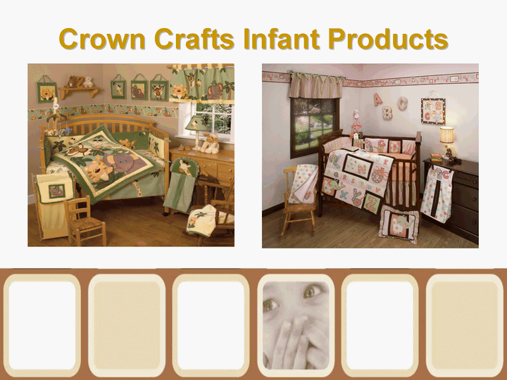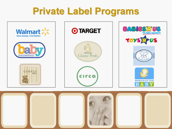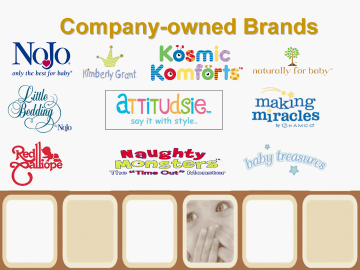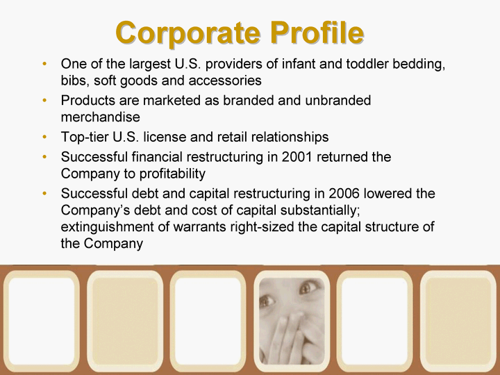 | Corporate Profile One of the largest U.S. providers of infant and toddler bedding, bibs, soft goods and accessories Products are marketed as branded and unbranded merchandise Top-tier U.S. license and retail relationships Successful financial restructuring in 2001 returned the Company to profitability Successful debt and capital restructuring in 2006 lowered the Company's debt and cost of capital substantially; extinguishment of warrants right-sized the capital structure of the Company |