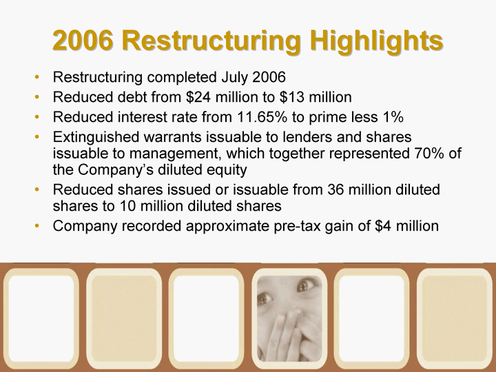 | 2006 Restructuring Highlights Restructuring completed July 2006 Reduced debt from $24 million to $13 million Reduced interest rate from 11.65% to prime less 1% Extinguished warrants issuable to lenders and shares issuable to management, which together represented 70% of the Company's diluted equity Reduced shares issued or issuable from 36 million diluted shares to 10 million diluted shares Company recorded approximate pre-tax gain of $4 million |