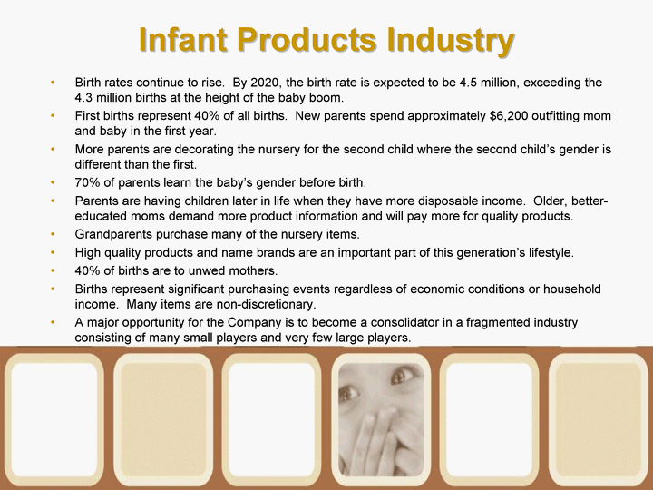 | Infant Products Industry Birth rates continue to rise. By 2020, the birth rate is expected to be 4.5 million, exceeding the 4.3 million births at the height of the baby boom. First births represent 40% of all births. New parents spend approximately $6,200 outfitting mom and baby in the first year. More parents are decorating the nursery for the second child where the second child's gender is different than the first. 70% of parents learn the baby's gender before birth. Parents are having children later in life when they have more disposable income. Older, better- educated moms demand more product information and will pay more for quality products. Grandparents purchase many of the nursery items. High quality products and name brands are an important part of this generation's lifestyle. 40% of births are to unwed mothers. Births represent significant purchasing events regardless of economic conditions or household income. Many items are non-discretionary. A major opportunity for the Company is to become a consolidator in a fragmented industry consisting of many small players and very few large players. |