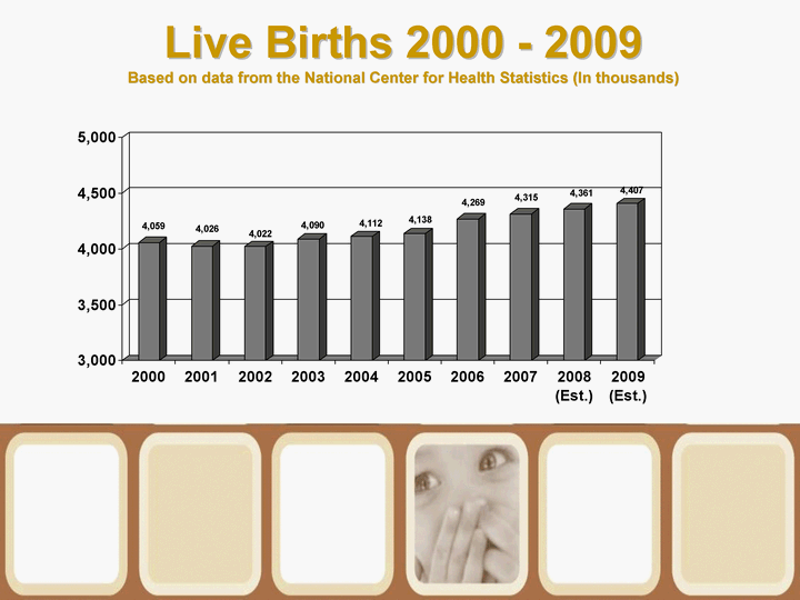 | Live Births 2000 - 2009 Based on data from the National Center for Health Statistics (In thousands) 2000 2001 2002 2003 2004 2005 2006 2007 2008 (Est.) 2009 (Est.) 4058.814 4025.933 4021.726 4089.95 4112.052 4138.349 4269 4315 4361 4407 |