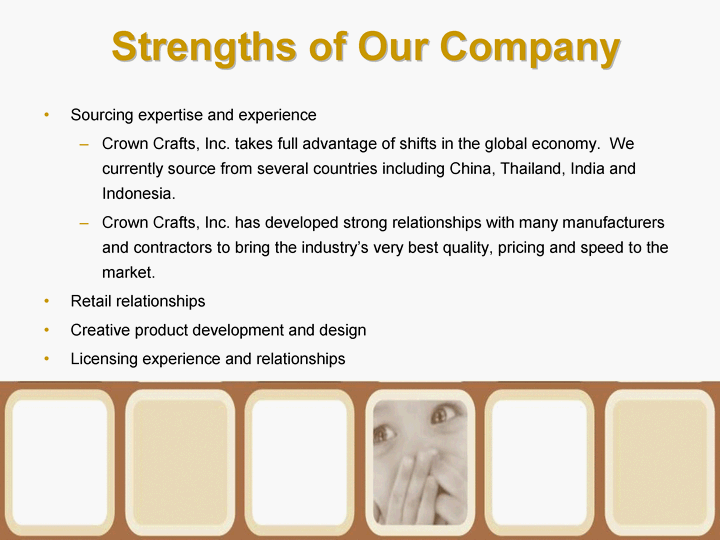 | Strengths of Our Company Sourcing expertise and experience Crown Crafts, Inc. takes full advantage of shifts in the global economy. We currently source from several countries including China, Thailand, India and Indonesia. Crown Crafts, Inc. has developed strong relationships with many manufacturers and contractors to bring the industry's very best quality, pricing and speed to the market. Retail relationships Creative product development and design Licensing experience and relationships |