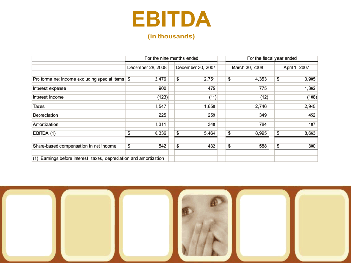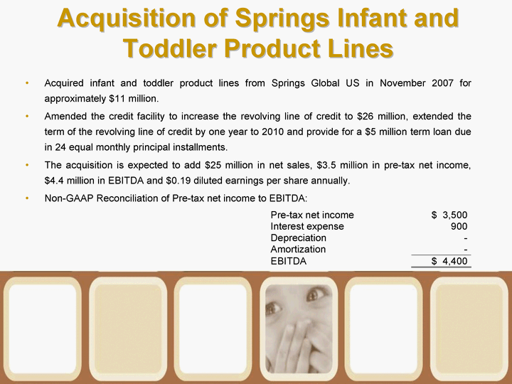 | Acquisition of Springs Infant and Toddler Product Lines Acquired infant and toddler product lines from Springs Global US in November 2007 for approximately $11 million. Amended the credit facility to increase the revolving line of credit to $26 million, extended the term of the revolving line of credit by one year to 2010 and provide for a $5 million term loan due in 24 equal monthly principal installments. The acquisition is expected to add $25 million in net sales, $3.5 million in pre-tax net income, $4.4 million in EBITDA and $0.19 diluted earnings per share annually. Non-GAAP Reconciliation of Pre-tax net income to EBITDA: |