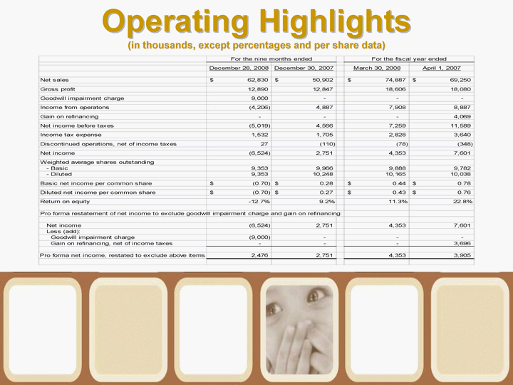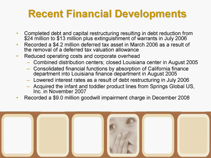 | Recent Financial Developments Completed debt and capital restructuring resulting in debt reduction from $24 million to $13 million plus extinguishment of warrants in July 2006 Recorded a $4.2 million deferred tax asset in March 2006 as a result of the removal of a deferred tax valuation allowance Reduced operating costs and corporate overhead Combined distribution centers; closed Louisiana center in August 2005 Consolidated financial functions by absorption of California finance department into Louisiana finance department in August 2005 Lowered interest rates as a result of debt restructuring in July 2006 Acquired the infant and toddler product lines from Springs Global US, Inc. in November 2007 Recorded a $9.0 million goodwill impairment charge in December 2008 |