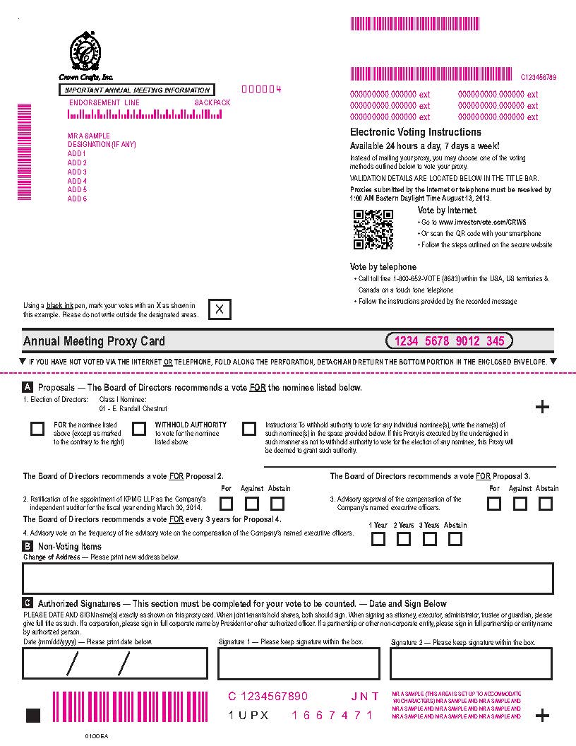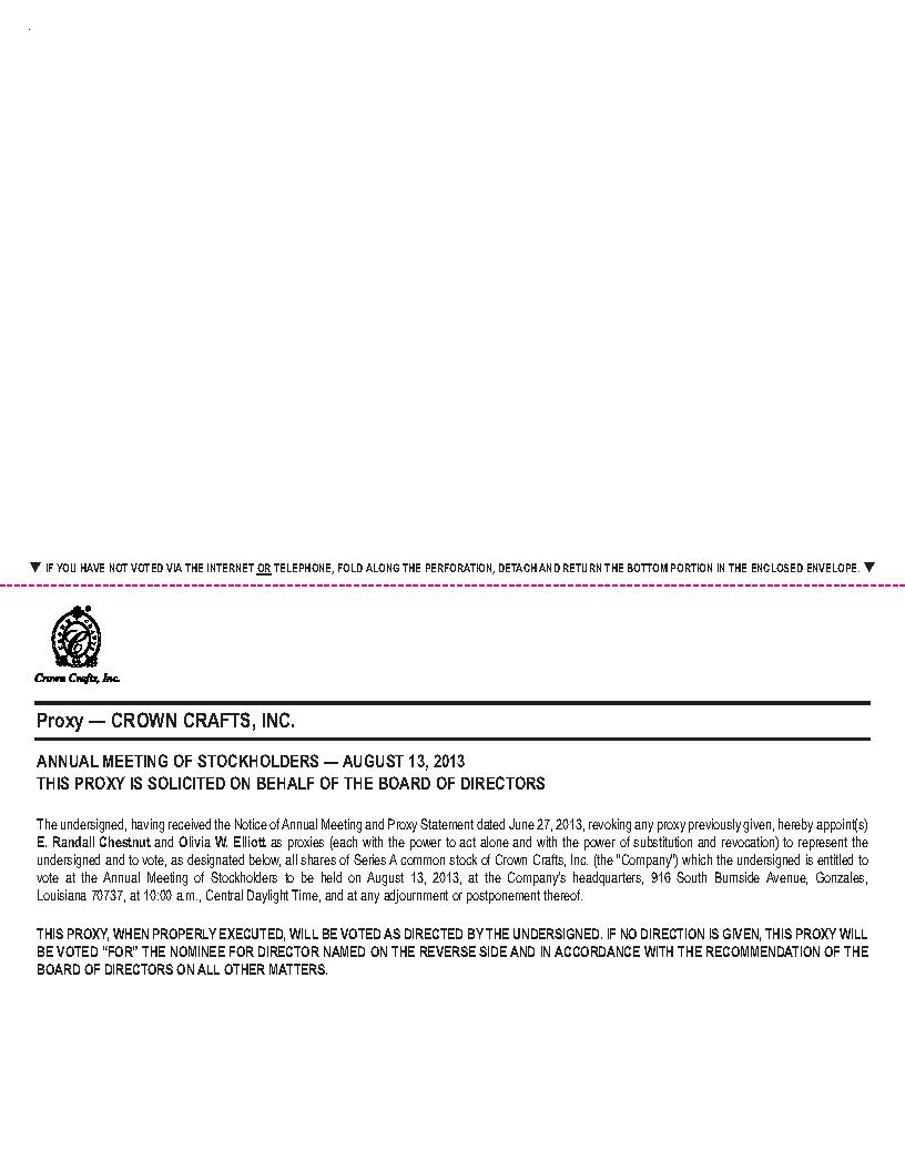 These items of business are described in the attached proxy statement. The board of directors has fixed June 14, 2013 as the record date to determine the stockholders entitled to notice of and to vote at the annual meeting. Only those stockholders of record of Crown Crafts Series A common stock as of the close of business on that date will be entitled to vote at the annual meeting or at any adjournment or postponement thereof.