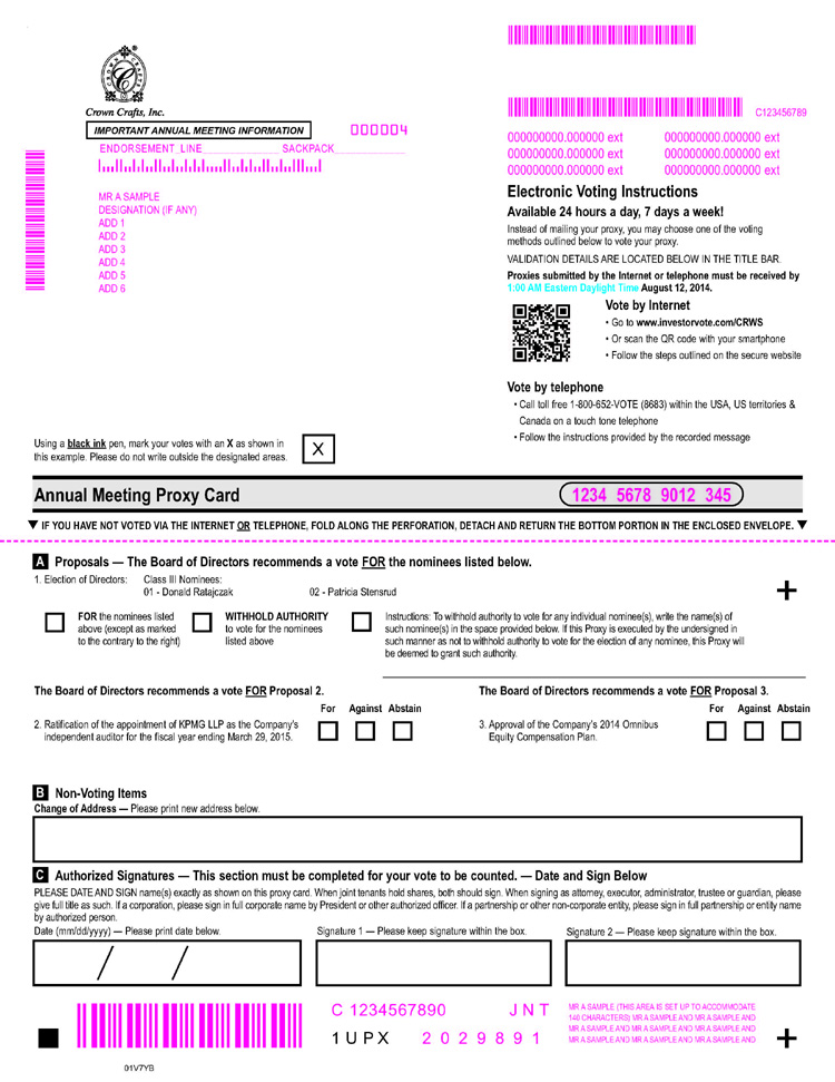 These items of business are described in the attached proxy statement. The board of directors has fixed June 13, 2014 as the record date to determine the stockholders entitled to notice of and to vote at the annual meeting. Only those stockholders of record of Crown Crafts Series A common stock as of the close of business on that date will be entitled to vote at the annual meeting or at any adjournment or postponement thereof.