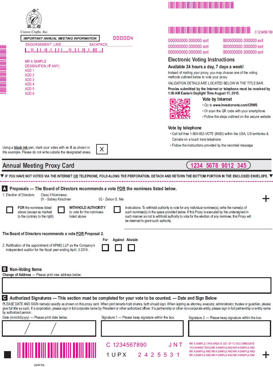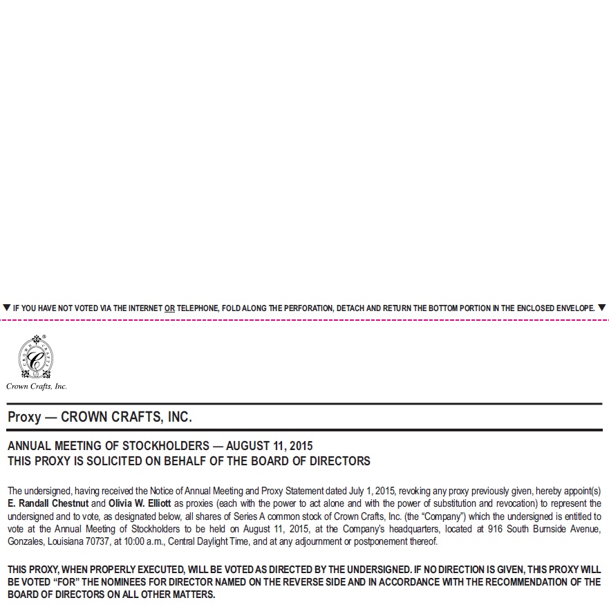 These items of business are described in the attached proxy statement. The board of directors has fixed June 12, 2015 as the record date to determine the stockholders entitled to notice of and to vote at the annual meeting. Only those stockholders of record of Crown Crafts Series A common stock as of the close of business on that date will be entitled to vote at the annual meeting or at any adjournment or postponement thereof.